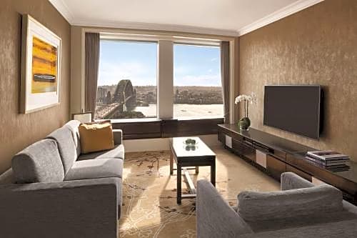 This suite features a 270-degree view of Sydney Harbor Bridge, Sydney Opera House and Sydney Harbor. It offers a spacious separate lounge room with views across the harbor, plus a queen size sofa bed, and second LCD television. Guests have unlimited access to Horizon Club on level 30, including breakfast, evening cocktails and canapes, and spectacular views